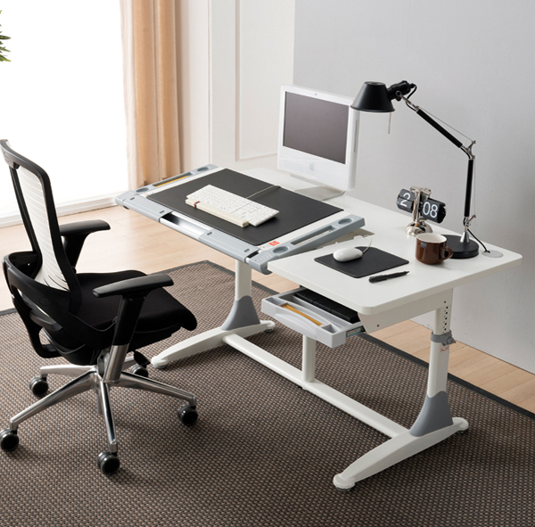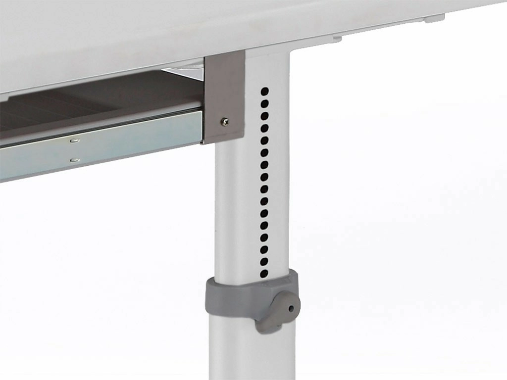 - Наклонная конструкция части столешницы - угол наклона 2/3 частей рабочей поверхности парты можно изменить, установив столешницу в наиболее удобном положении для выбранного вида работы. Сделать это без особых усилий при переходе от одного вида деятельности к другому может даже школьник. Остальная часть столешницы при этом остается неподвижной – на ней можно расположить все необходимые учебные и канцелярские принадлежности.