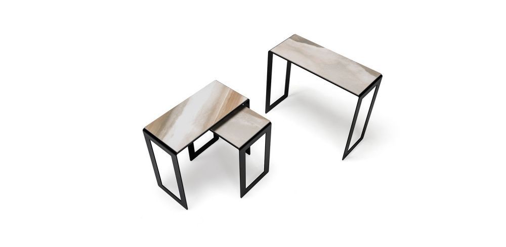 Кофейный столик с базой из стали, окрашенной в матовый белый (OP71), черный (OP17) или графитовый (OP69) цвет. Топ в керамике под мрамор цветов: Calacatta (KM01), Alabastro (KM02), Ardesia (KM04), матовая matt Portoro (KM07) или глянцевая glossy Portoro (KM08).