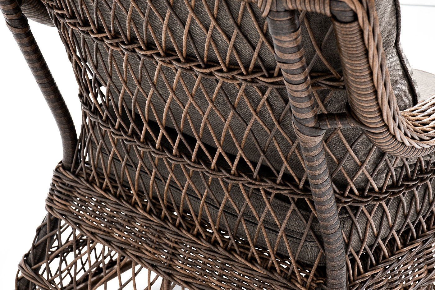 Укомплектовано плетеное кресло удобными мягкими подушками, одна из которых располагается в области спинки. Они выполнены в серо-коричневом оттенке. При пошиве тканевых изделий используется полиэстер, плотностью 230гр/м2. Он в обязательном порядке проходит обработку влагоотталкивающей пропиткой.