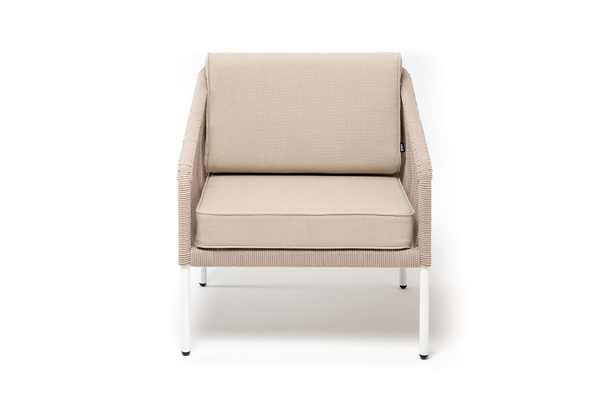 "Канны" кресло плетеное из роупа, каркас алюминий белый муар, роуп бежевый круглый, ткань бежевая 052