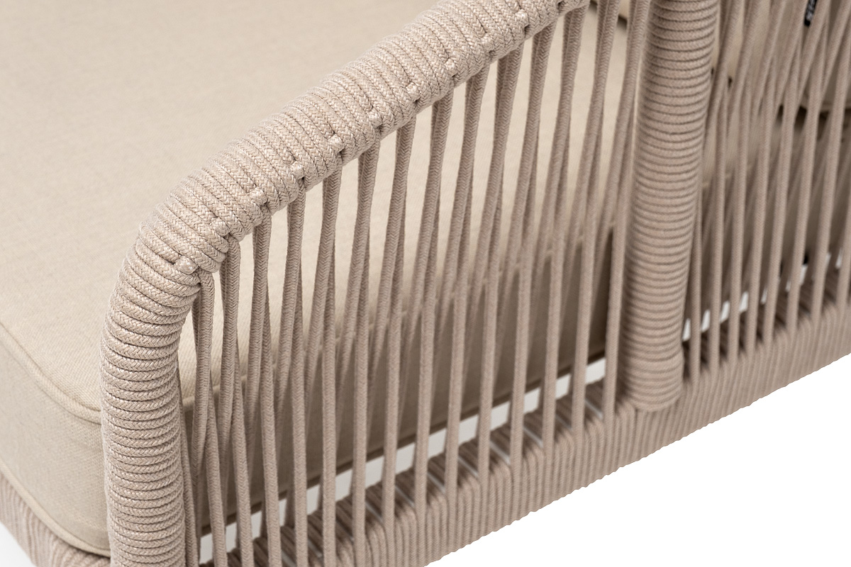 Приятное дополнение − подушки со съёмными чехлами аналогичного бежевого оттенка из влагоотталкивающей ткани, устойчивой к ультрафиолетовым лучам и неблагоприятным атмосферным воздействиям.