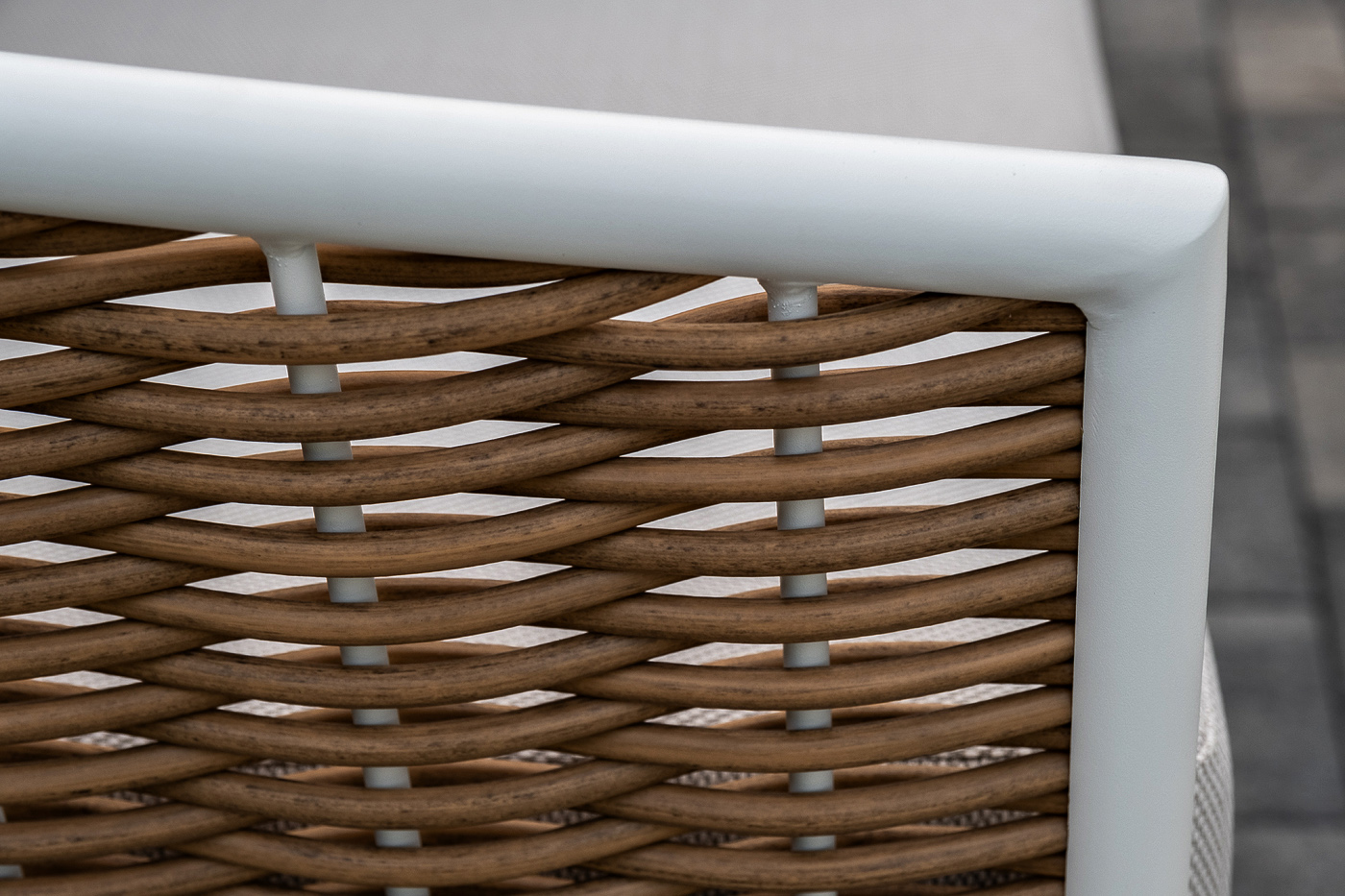 Плетеная мебель дополнена удобными подушками в бежевых чехлах. При их изготовлении используют полиэстер, плотность – 300гр/м2. Он обрабатывается влагоотталкивающей пропиткой для повышения защитных свойств материала.
